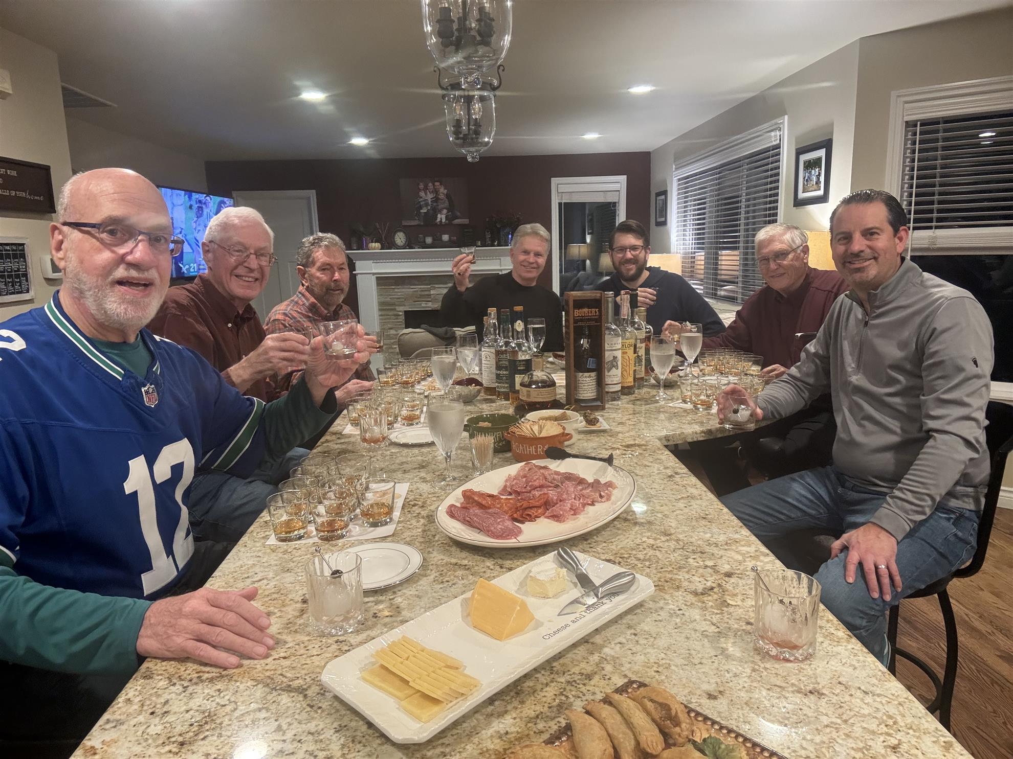 The Rotary Club of Kirkland held its auction back in September and Rick Ostrander cashed in his purchase of whiskey tasting for six at Rotarian Brandon Honcoop’s house that Brandon was so kind to offer up as an auction item. We were greeted with Manhattans when we arrived and to a very elegant table setting. Ten samples ranging from Bourbon to Rye to Scotch Whiskey were sipped and tons of snacks to keep us fed. We received a tour later of Brandon’s extensive collection of whiskeys and wine. Then we sat down again for a hardy stew to complete the night. In attendance were from left to right, Rick Walter, Dave Aubry, John Pruitt, Rich Bergdahl, Cody Baker, Rick Ostrander and our host Brandon Honcoop.