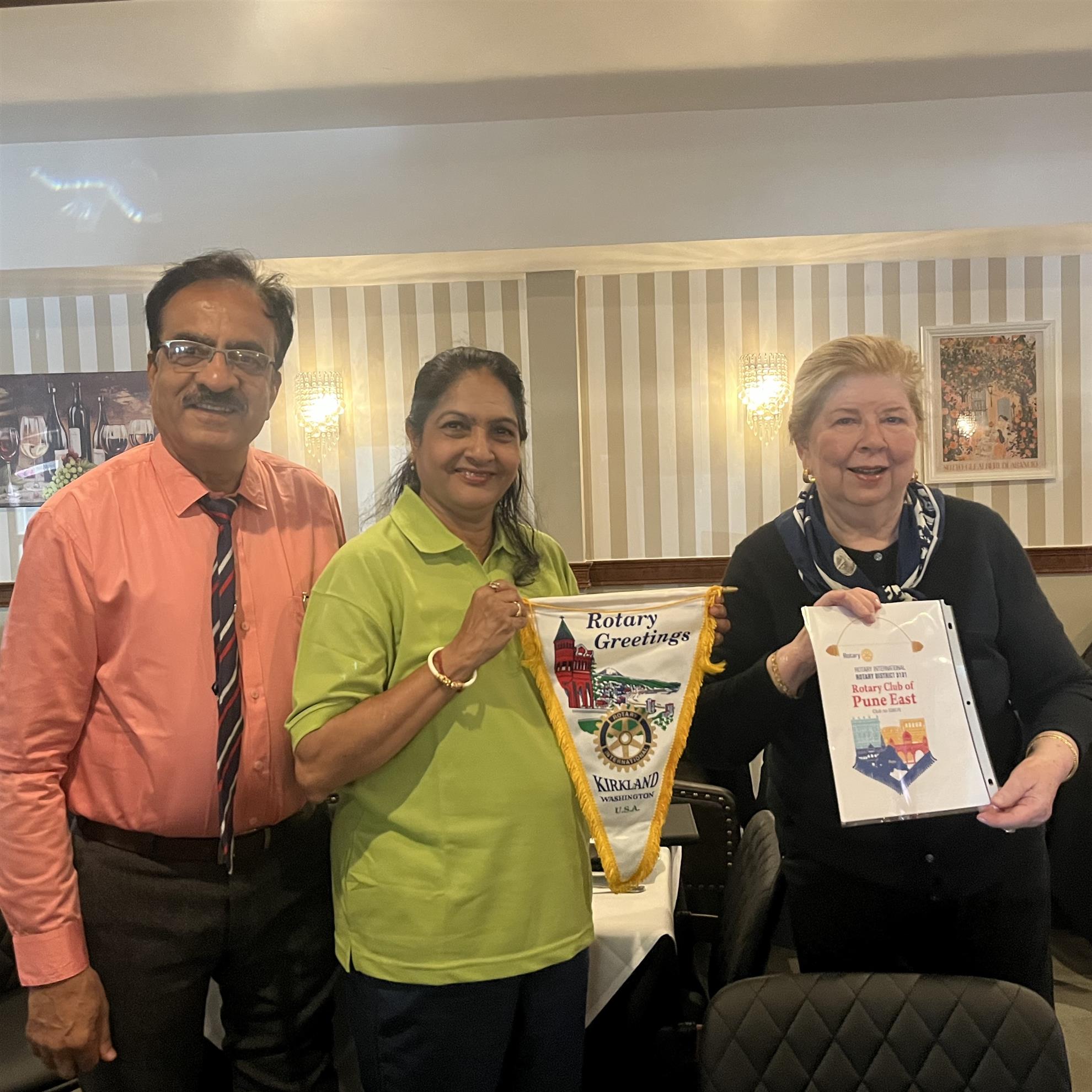 Rotarians Dr. Amrut Oswal, an orthopedic surgeon from Pune, India, and his wife, Alka, who is president-elect for 2025-2026 of the Rotary Club of Pune East, District 3131, are pictured with Dr. Jocelyn Reiter Ellison, our club president-elect for 2025-2026, participating in a club flag exchange during the May 19 Rotary Club of Kirkland meeting.